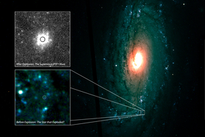 Using data from the Keck II and Hubble Space Telescopes, this composite image shows the supernova iPTF13bvn, and its possible progenitor star, in the galaxy NGC 5806.