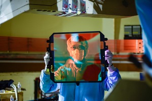 Technical lead Roger Smith, of Caltech Optical Observatories, inspects one of the three wide-field optical filters used for the ZTF science survey.